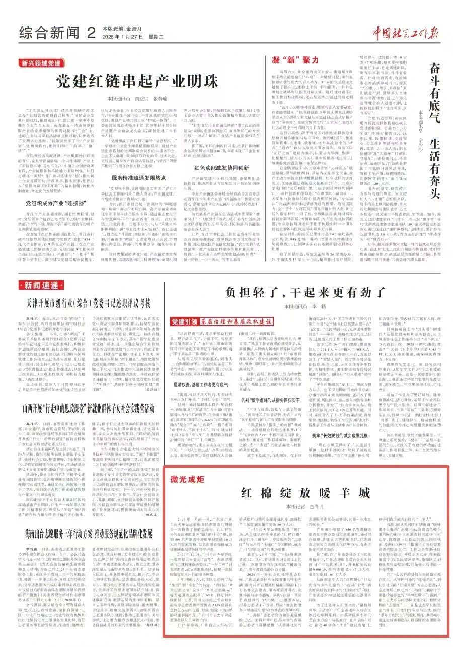 从面向老年人的“红棉暖心”行动到面向少年儿童的“小红棉”计划,再到面向新就业群体的“红暖新光”项目,广州正逐步构建起全覆盖的志愿服务网络。